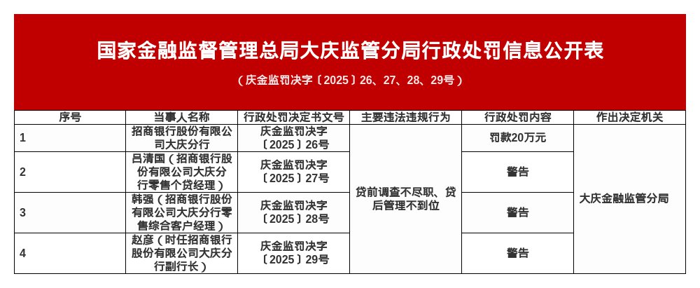 罚单显示,招商银行股份有限公司大庆分行的主要违法违规事实(案由)为:贷前调查不尽职、贷后管理不到位。